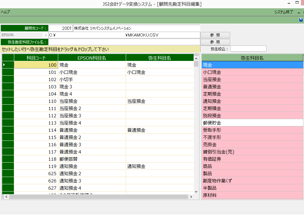 変換を行いたい各会計ソフトウェアの科目ファイルを取り込み、マッチングさせます。