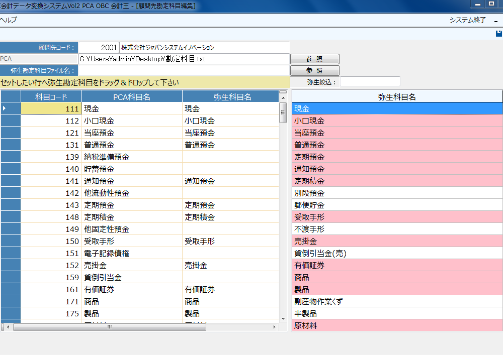 変換を行いたい各会計ソフトウェアの科目ファイルを取り込み、マッチングさせます。
